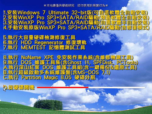 (3)全手動安裝:最乾淨原始的XP SP3安裝,除了免安裝序號以外,一切均為手動